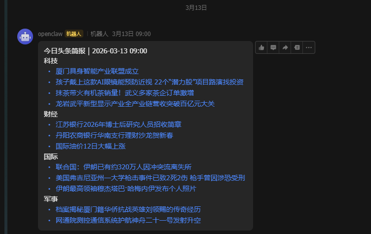 如下面应用中我们公司群内的 每日晨报、就是模型写了一个 get-news.py 调用相关的api,获得各个领域的头条,然后把执行结果送给模型后 模型润色输出一份发送在群里供大家查看