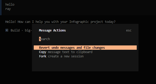 但是几个亮点用的时候就震惊到我了。这个TUI可以和鼠标交互的含金量让我感到爽!点击一条message的时候 居然可以进行 revert、copy、fork,惊呼了要。先研究一下怎么配置模型。