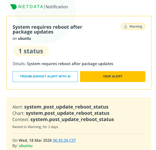 触发原因:Ubuntu 系统最近通过 apt 安装了一些软件包更新(最常见的是 Linux 内核 linux-image 或核心库如 libc6),这些更新需要重启系统才能完全生效。Netdata 检测到系统中存在 /run/reboot-required 这个文件(以及里面的 /run/reboot-required.pkgs 列出了具体包),就触发了这个警告。
